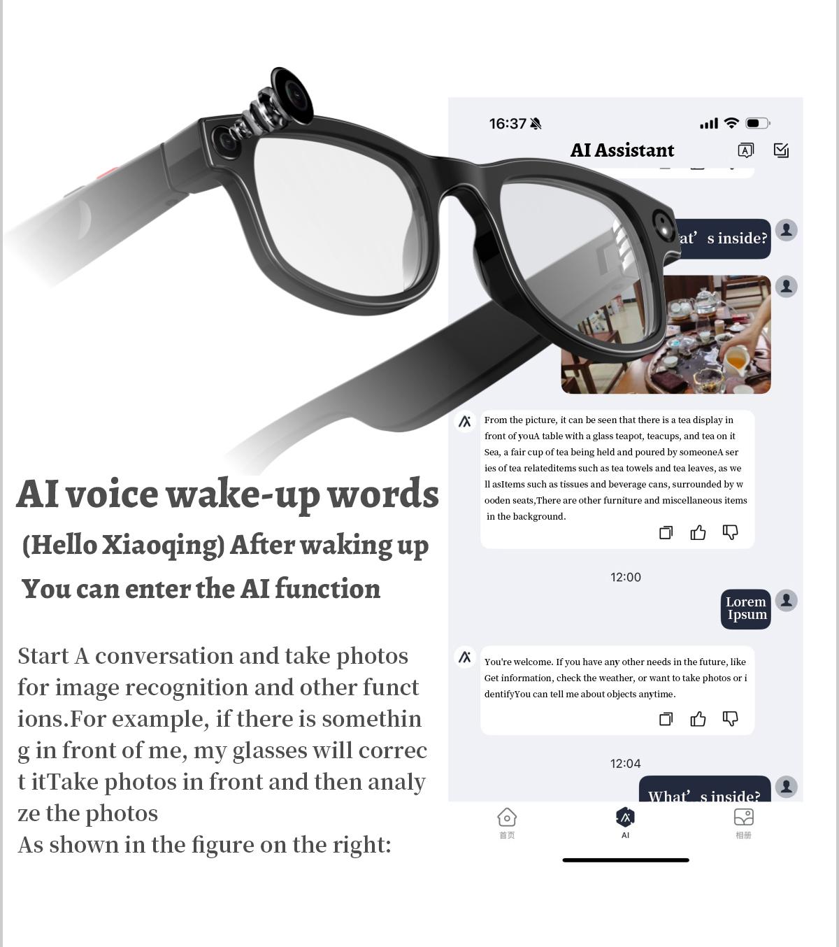 AI photo recognition answers, photography, video, recording, AI dialogue intelligent interaction, Bluetooth calls, local music, music playback (switching, pausing music appreciation), low-power JL7018F main control chip, long-lasting battery life, convenient operation of dual physical buttons + dual touch buttons, comfortable wearing of 35g lightweight machine weight, configurable sunglasses, blue light and other lenses, 270MA large battery, ultra-low power consumption (supports continuous recording for more than 2 hours without heating), connect to ChatGPT's advanced model, high image recognition ability and high accuracy