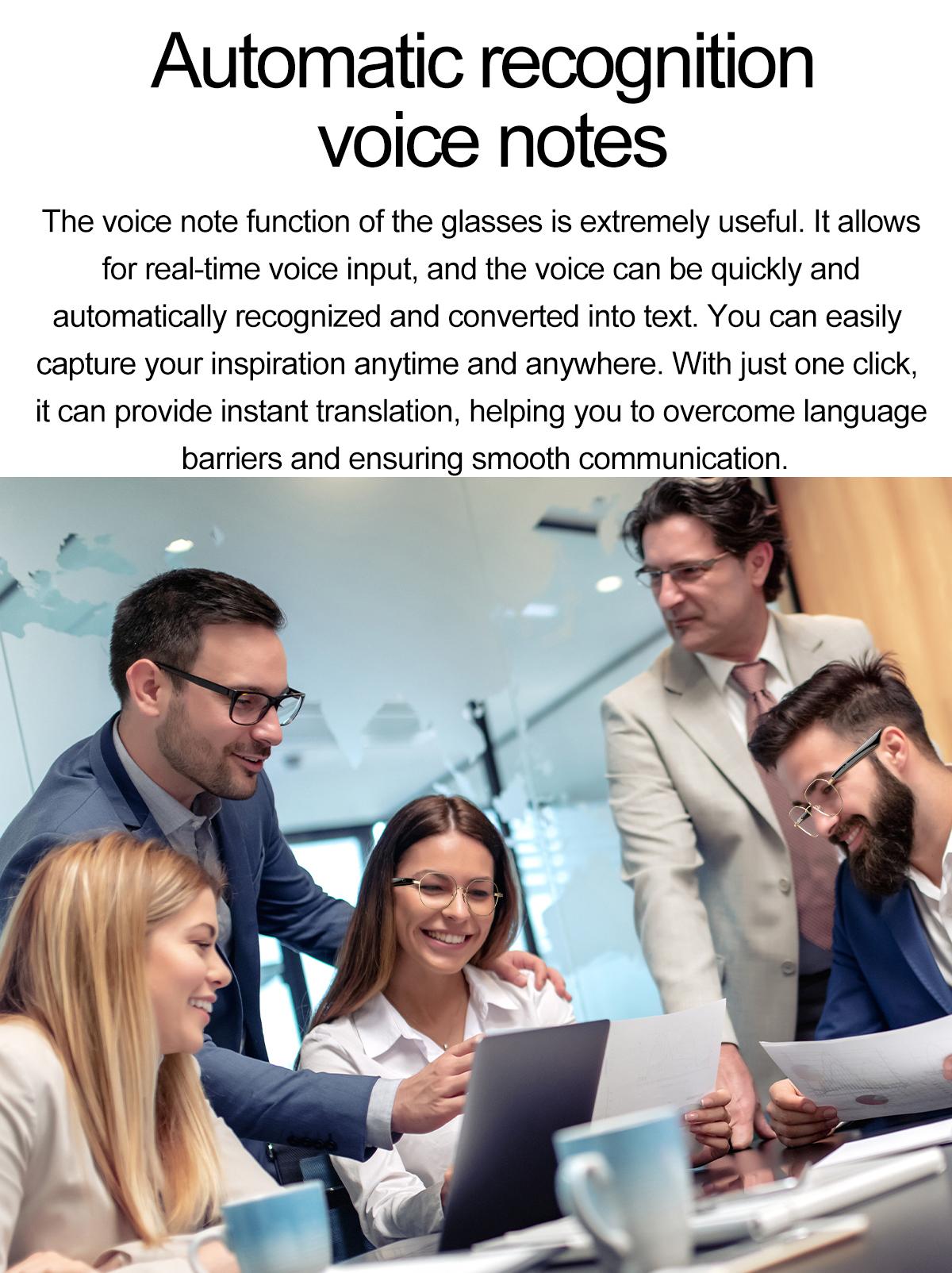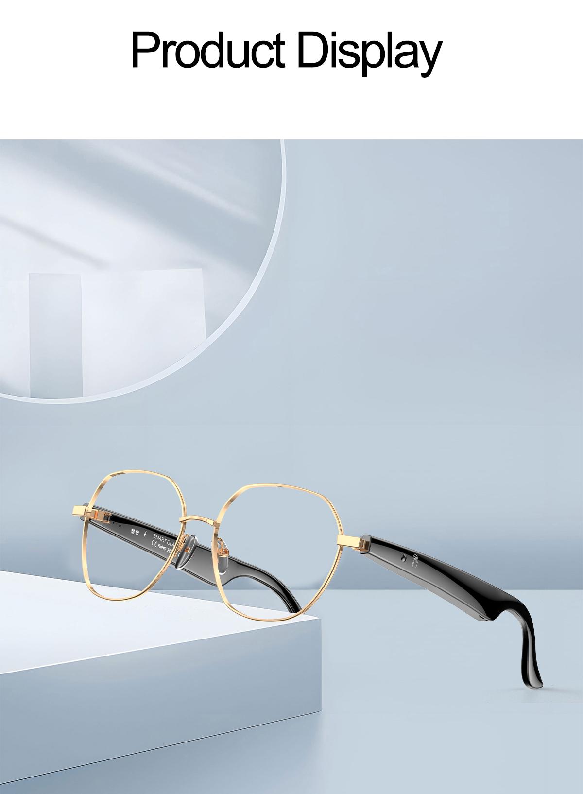 AI Bluetooth Audio Communication Fashion Smart Glasses: AI intelligent voice and video real-time translation, AI dialogue and Q&A, AI intelligent translation (translation machine mode, glasses+phone translation mode. Can translate more than 163 languages), voice note, sleep aid mode, photo translation, remote control photo, Bluetooth communication, intelligent Hall sensor automatic on/off, intelligent voice assistant, music playback (switching, pausing music appreciation), using low-power AB5712F chip, ENC noise reduction, ultra-low latency, long-lasting battery life, lightweight 25g, comfortable to wear, configurable sunglasses, blue light, close view and other lenses.
