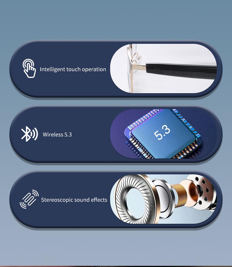 AI voice wake-up, AI photo recognition, AI intelligent question-and-answer interaction, AI smart translation, high-definition photography and video recording (with anti-shake function), recording, Wi-Fi transfer of photos, videos, and recordings to phone, slide to adjust volume, wear detection, dual microphone noise reduction, call noise reduction, intelligent voice assistant, Bluetooth calls, music playback (switch, pause music), low power consumption Jerry + Allwinner main control chip, long-lasting battery life, dual physical buttons plus slide touch for convenient operation, grams lightweight overall weight for comfortable wearing, customizable sunglasses, blue light protection, color-changing, myopia, and other lenses, large