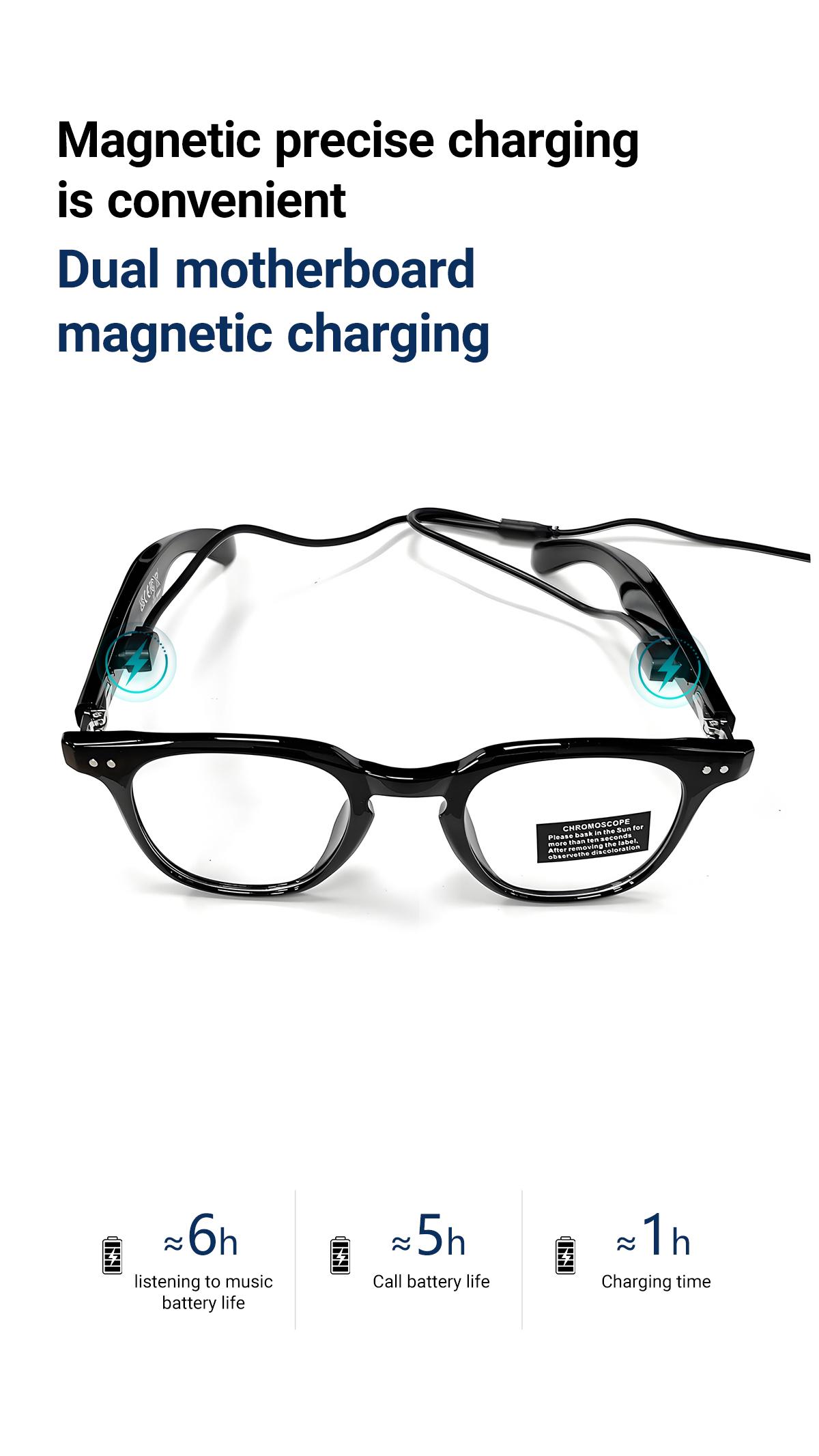 Main control chip:AB5636H Battery :50mAh+50mAh Charging way:Magnetic charging Bluetooth version:BLE5.4 Bluetooth protocol:A2DP,HFP Mode of operation:Touch Transmission distance :10M Waterproof level :Life waterproof Material :ABS+TR90 Voltage :DC5V Electric current:50mA*2 Play current (max volume):22mA Standby current :1mA Lens Material:Anti-blue light photochromic gray lenses lens Size :170*70*52mm Weight:Glasses35g + packing box 112g = 147g Outer box specifications :390*360*280mm 50pcs/8.2KG Language English Functions:Bluetooth calling/music playback/games/multi-style menu/voice assistant/weather/remote camera LENS EFFECT :Anti-blue light/Anti-glare Packing:Smart Glasses charging cable, storage pouch, cleaning cloth, user manual, packaging box