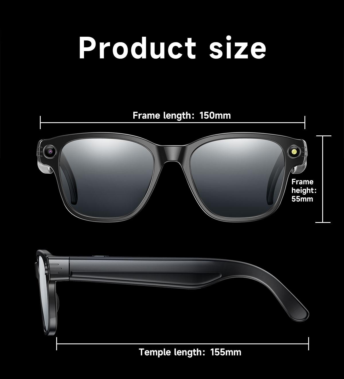 Functions: Camera function (photo taking & video recording), WIFI transmission (image/video/audio), sound recording, AI real-time translation, AI photo recognition, AI intelligent question & answer interaction, wireless call (answer & reject), voice assistant (AI voice wake-up), built-in headphones & speaker (stereo sound), music playback, anti blue light, UV protection.