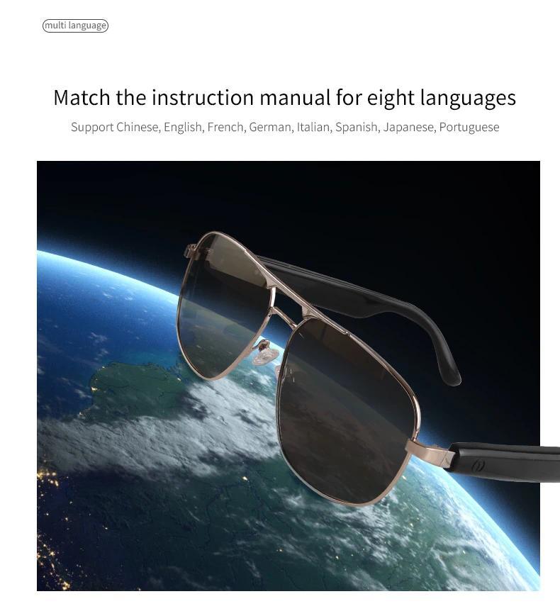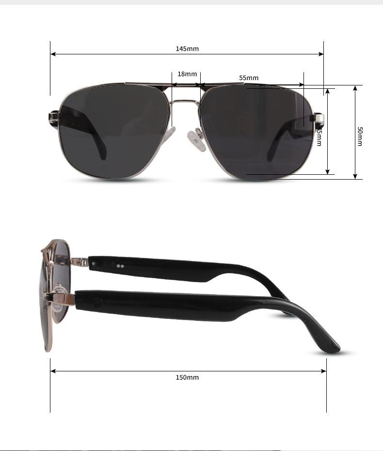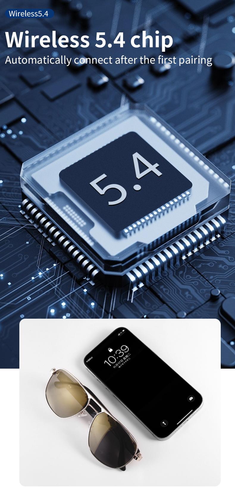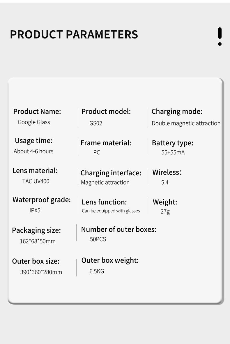 Main control chip:AB5656C  Battery:55mAh+55mAh Charging way:Magnetic charging Bluetooth version:BLE5.4 Bluetooth protocol:A2DP,HFP Mode of operation:Touch Transmission distance    :10M Waterproof level:Life waterproof Material    :ABS+PC+Metal Voltage    :DC5V Electric current:50mA*2 Play current (max volume)    :22mA Standby current:1mA Lens Material:PC coating Size    :162*68*50mm Weight    :Glasses 31g + packing box 110g = 138g Language;English USE CASE:Drive Cycling Mountain climbing Fishing Travel Businesst Daily LENS EFFECT :UV protection / UV400 / Anti-glare / wind and sand prevention / corrosion protection/ Anti-blue light Functions:Bluetooth calling/music playback/games/multi-style menu/voice assistant/weather/remote camera{need to be customized}