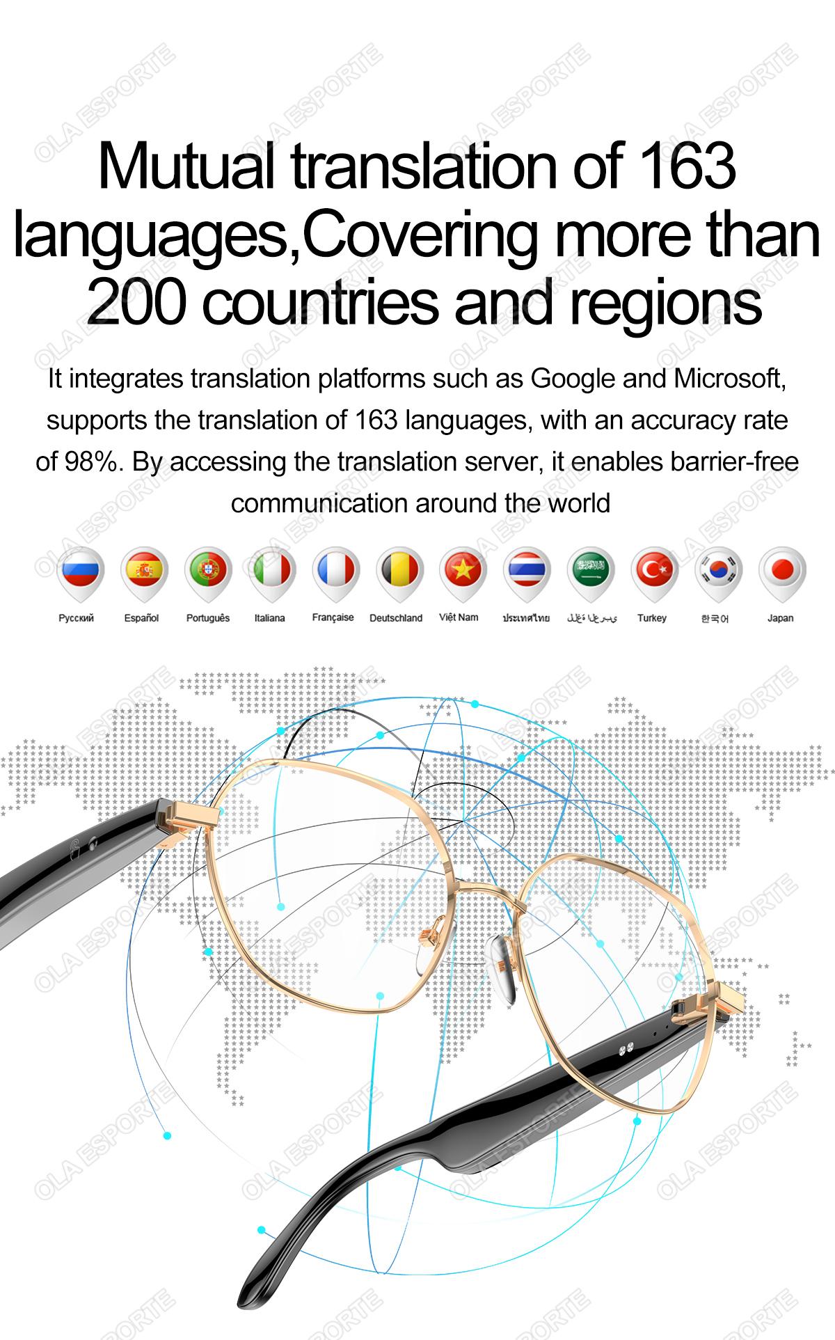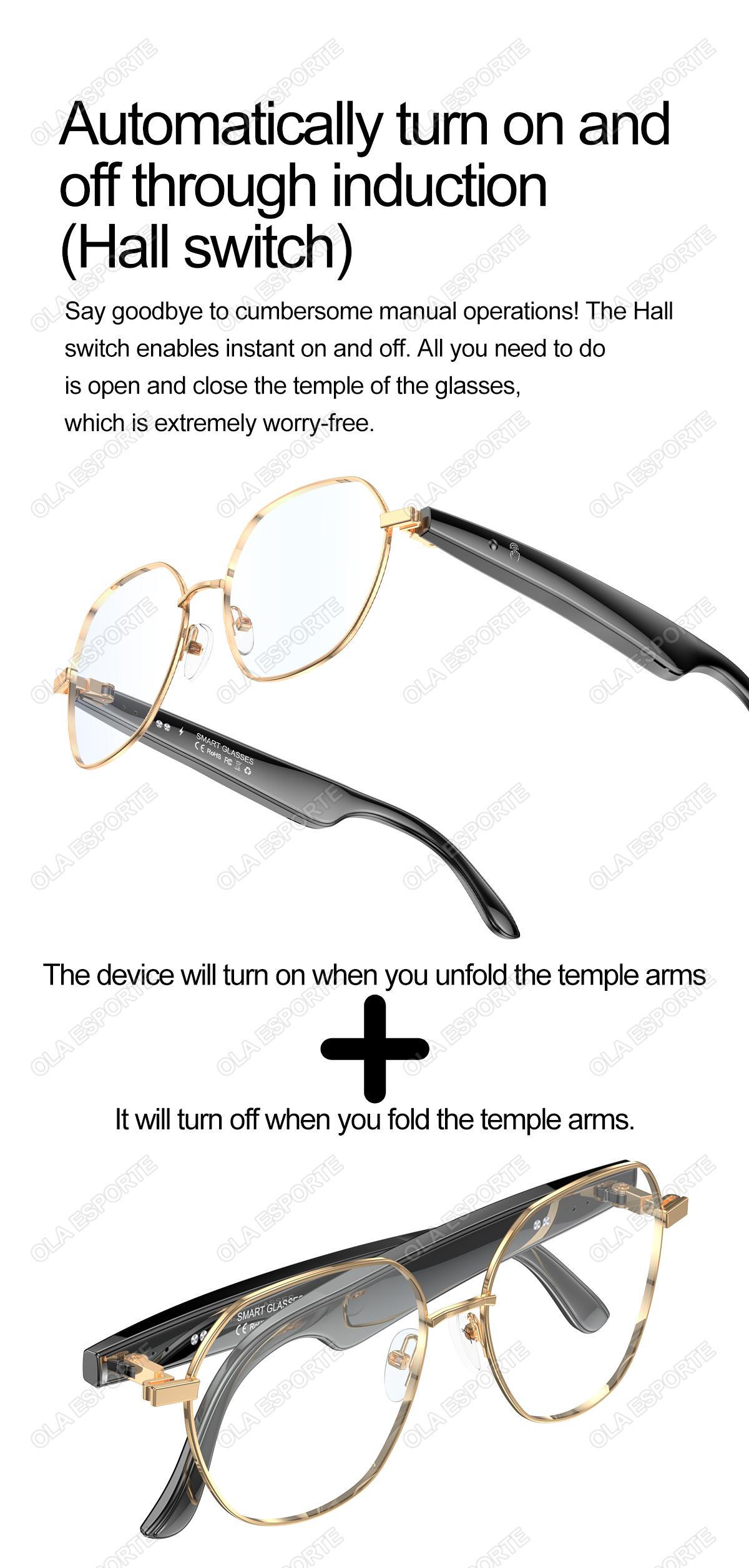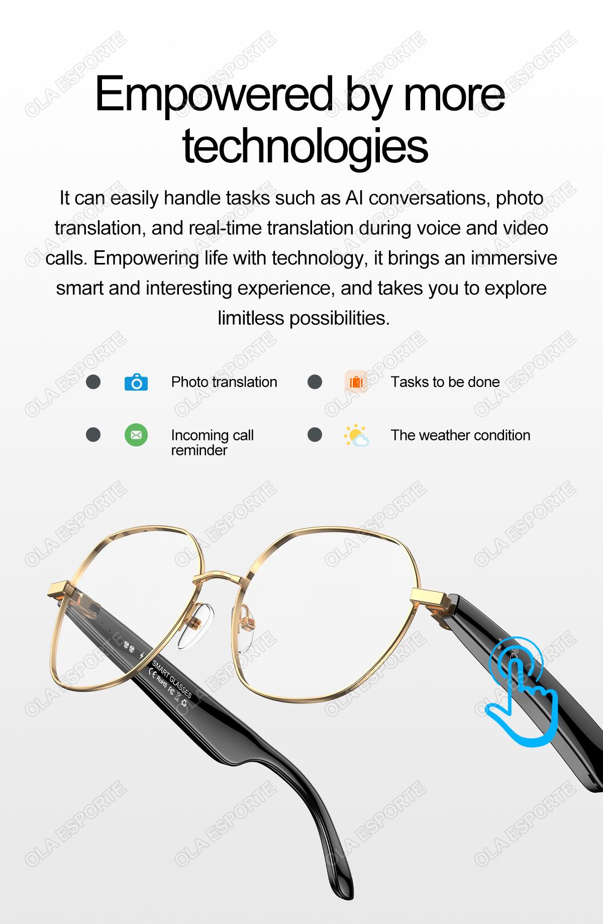 AI Bluetooth Audio - call Fashion Smart Glasses: AI conversation, AI intelligent translation (Translator mode, Glasses + Mobile phone translation mode. Capable of customizing translations for over 134 languages), voice notes, sleep - aid mode, photo translation, remote - controlled photo taking, Bluetooth call, intelligent Hall - effect sensor for automatic power - on/off, intelligent voice assistant, music playback (switching and pausing for music enjoyment), remote - controlled photo taking. It uses the low - power - consumption AB5712F chip, ensuring long - lasting battery life. Weighing only 25g, it provides a comfortable and unnoticeable wearing experience. It can be equipped with various lenses such as sunglasses, blue - light - blocking lenses, and myopic lenses.